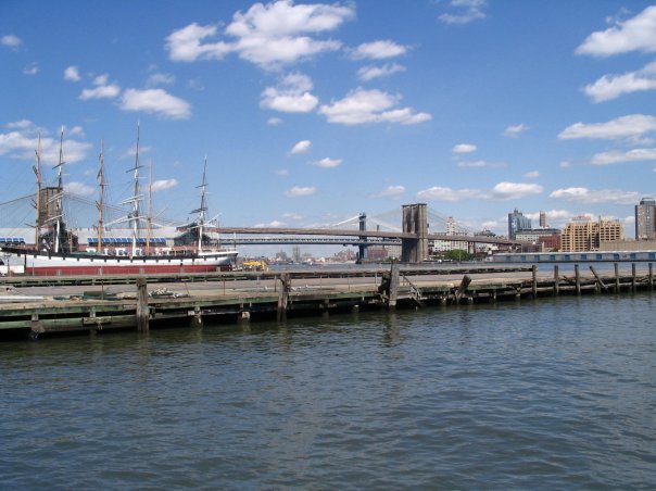 A seaport pier, with the Brooklyn Bridge in the distance.