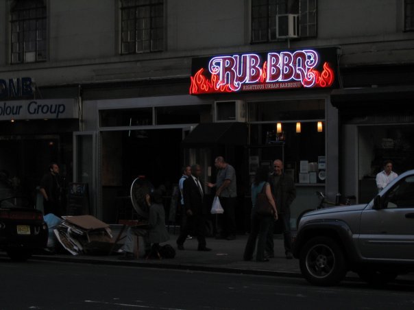 The RUB (Righteous Urban Barbeque) restaurant in Chelsea, at dusk. We ate our last dinner in NYC here. The ribs were good, but the baked beans were probably one of the most memorable things we ate on the whole trip! Fantastic. (Sadly RUB closed in 2013 after a combination of misfortunes including an SUV crashing through their window and Hurricane Sandy.)