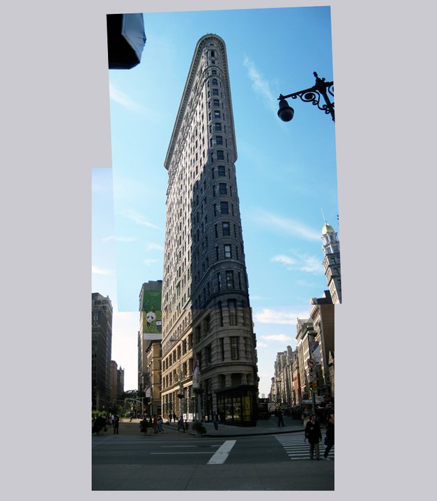 A composite of two photos I took of the Flatiron building on Broadway. I couldn’t get far enough back to fit it all in, so I took two photos and mashed ’em together in Photoshop. You get the idea. Too bad it’s in the shade.